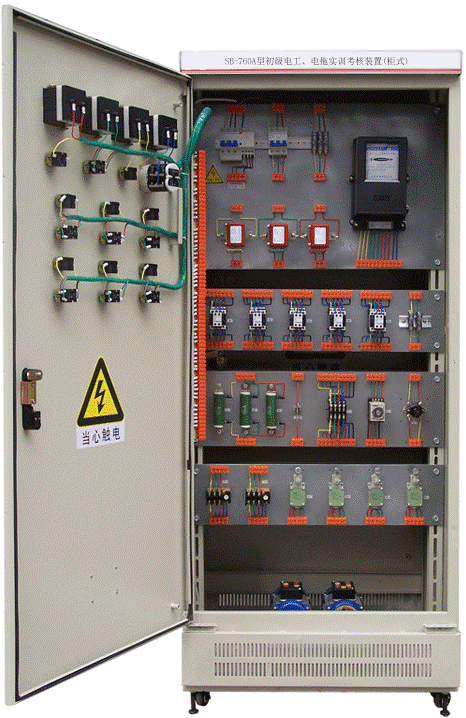 初級(jí)電工電拖實(shí)訓(xùn)考核裝置,初級(jí)電工考核柜,初級(jí)電工實(shí)訓(xùn)考核裝置是按照勞動(dòng)社會(huì)保障部頒發(fā)的“工人技術(shù)等級(jí)標(biāo)準(zhǔn)”和“職業(yè)技能鑒定規(guī)范”的內(nèi)容要求,根據(jù)初級(jí)電工培訓(xùn)考核的實(shí)際情況而設(shè)計(jì)的新一代集培訓(xùn)學(xué)習(xí)、理論驗(yàn)證、實(shí)際操作能力、考核鑒定于一體的多功能柜式設(shè)備。整臺(tái)設(shè)備以標(biāo)準(zhǔn)的電氣控制柜為主柜,利用柜體的雙面空間,布置電器  及配套實(shí)驗(yàn)器材,能完成初級(jí)電工考核鑒定中的電力拖動(dòng)控制與照明電路的實(shí)操項(xiàng)目,該電工、電拖實(shí)訓(xùn)考核裝置堅(jiān)持理論聯(lián)系實(shí)際的原則,突出技能訓(xùn)練,注重針對(duì)性、實(shí)用性、科學(xué)性,經(jīng)全國(guó)多家職業(yè)技能訓(xùn)練中心、職校、技校使用證明,該柜體設(shè)計(jì)合理、實(shí)操方便,占地面積少。為延長(zhǎng)電器的使用壽命,各電器的接點(diǎn)都與接線端子相連,再讓學(xué)生在接線端子上接線,連接電機(jī)、電器來(lái)完成各項(xiàng)控制實(shí)驗(yàn),有效降低材料消耗,延長(zhǎng)使用壽命。該套設(shè)備適用于各勞動(dòng)職業(yè)技能鑒定部門,同時(shí)適應(yīng)各大、中專、技校、職校初級(jí)電工、電拖專業(yè)教學(xué)與實(shí)訓(xùn)考核。