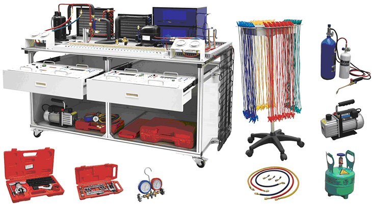 1、實訓臺采用鋁型材臺架加實訓模塊結構,裝置采用一體化設計,由導軌式鋁合金安裝平臺、空調(diào)系統(tǒng)、電冰箱系統(tǒng)、電氣控制系統(tǒng)等組成。底部安裝有四個帶剎車的腳輪,可以方便的移動和固定。設備配置空調(diào)制冷系統(tǒng)管路1套、直冷電冰箱制冷系統(tǒng)管路1套、安全插端子排,壓力表(1.5MPa2只(3.5 MPa2只等。