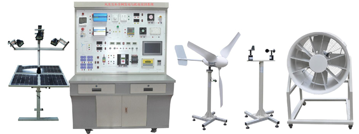 系統(tǒng)裝置由太陽能光伏電板、雙軸跟蹤控制模塊、蓄電池模塊、太陽能控制器模塊、太陽能逆變器模塊、模擬風(fēng)洞發(fā)電模塊、開關(guān)控制模塊、環(huán)境監(jiān)測模塊、上位機(jī)監(jiān)控模塊,儀表顯示部分,(各功能轉(zhuǎn)換接口模塊)等組成;各控制系統(tǒng)集成于風(fēng)能發(fā)電、光伏發(fā)電為一體的教學(xué)實(shí)訓(xùn)臺;各系統(tǒng)通過連接電纜進(jìn)行連接,形成一套可完成風(fēng)力及光伏發(fā)電、同步并網(wǎng)、離網(wǎng)電源的實(shí)驗(yàn)及教學(xué)演示。幫助學(xué)生理解太陽能并網(wǎng)、離網(wǎng)及風(fēng)力發(fā)電系統(tǒng)的原理,從而起到學(xué)習(xí)工程實(shí)際應(yīng)用技能的作用。