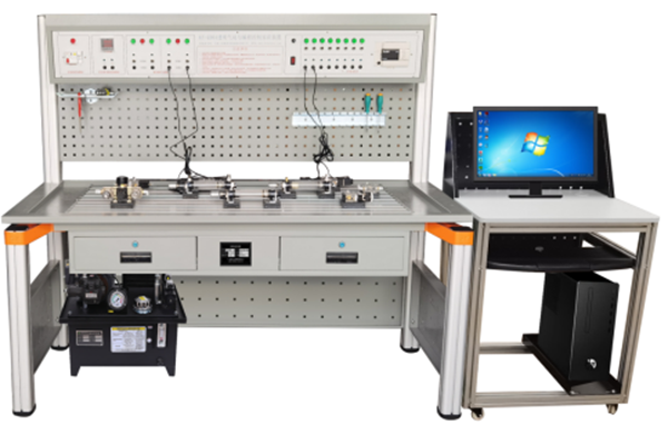 液壓綜合實驗臺由實驗桌、實驗操作區(qū)、網(wǎng)孔工具掛板、液壓泵站、常用液壓元件、主控機箱、電腦桌等幾部分組成。