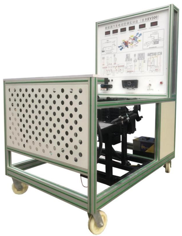 點火開關、電動汽車空調(diào)壓縮機、膨脹閥總成、干燥器總成、鼓風機總成、冷凝器、冷卻電子風扇、電動空調(diào)壓縮機控制器總成、空調(diào)蒸發(fā)箱總成、充電器與充電接口、充電插線、DC-DC轉(zhuǎn)換器、鋰電池組、空調(diào)操作面板、高低壓空調(diào)壓力表、采暖模塊總成、電源總開關、急停開關、直流接觸器、輔助蓄電池(12V45AH)、一體化全鋁合金型材搭建的移動臺架(1500×1000×1700mm ,帶自鎖腳輪裝置,帶安裝檢測端子的原理面板948×898mm)、故障模擬與排除裝置、設備操作說明書。