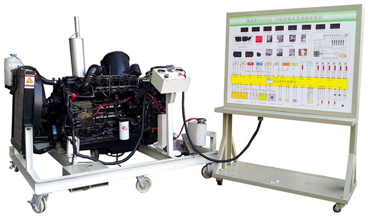 CA1125柴油發(fā)動機總成、組合儀表、發(fā)動機控制單元、散熱系統(tǒng)(水箱、風(fēng)扇、上下水管)、排氣系統(tǒng)、進氣系統(tǒng)(進氣軟管、空氣濾清器總成)、原車電路原理圖板及檢測端子面板、蓄電池、電源總開關(guān)、燃油箱、油水分離器、油門踏板裝置、可移動機臺架、臺架高溫及轉(zhuǎn)動等部位加裝防護裝置等。