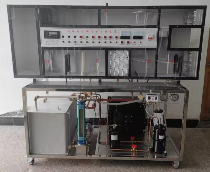 空氣熱濕處理實驗裝置為《空氣調(diào)節(jié)》課程實驗教學設(shè)備,用它可以模擬不同季節(jié)室內(nèi)和室外的環(huán)境和空氣處理調(diào)節(jié)的方法,進 行集中式空調(diào)系統(tǒng)不同循環(huán)形式的空氣調(diào)節(jié)實驗。還可以 做變風量運行調(diào)節(jié)實驗和制冷系統(tǒng)的參數(shù)測定及其調(diào)節(jié)實驗。裝置具有透明風管,可直觀地觀察和測試。實驗裝置的 結(jié)構(gòu)由空氣循環(huán)系統(tǒng)、加濕器、加熱器、冷卻器及其冷水 機組和相應(yīng)的測試儀表等組成?梢詫崿F(xiàn)對空氣的加熱、冷卻、加濕和除濕(表冷式和淋水式可互換使用)等處理。 在實驗中,還可以對空氣的溫度、濕度、流量進行測量,并 能對加溫器、加熱器的輸入電功率進行測定,從而可以計算各空氣處理過程中的熱量和濕量得失,以及進行熱、濕平衡 的分析。
