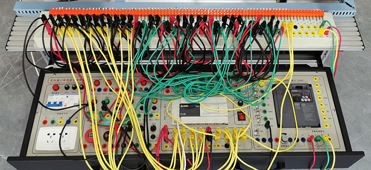 3.開放性:該實驗裝置PLC模塊I/O端子、變頻器的接線端子、各常用模塊與PLC的連接端子、傳感器、按鈕開關、指示燈元件等端子全部開放,均采用護套插座導線連接,可進行電氣線路控制、電氣線路設計等內容實訓。
