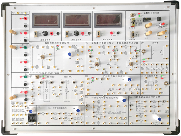 由鋁木合金材料制作箱體,無任何污染源,箱體內(nèi)含直流穩(wěn)壓工作電源、實驗用恒流源和恒壓源、測量用直流電流表、直流電壓表、實驗電路模塊區(qū)等組成。